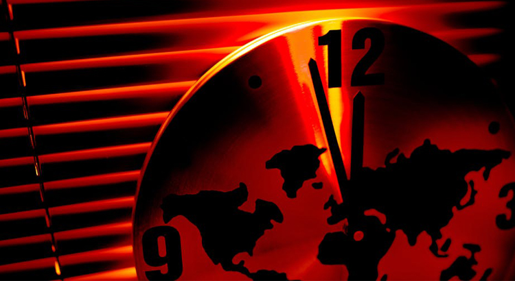 Criado por um grupo de cientistas em 1947, o Doomsday Clock assinala o perigo de uma catástrofe mundial em decorrência de ameaças várias. Quando mais próximo da meia-noite, maior o perigo.